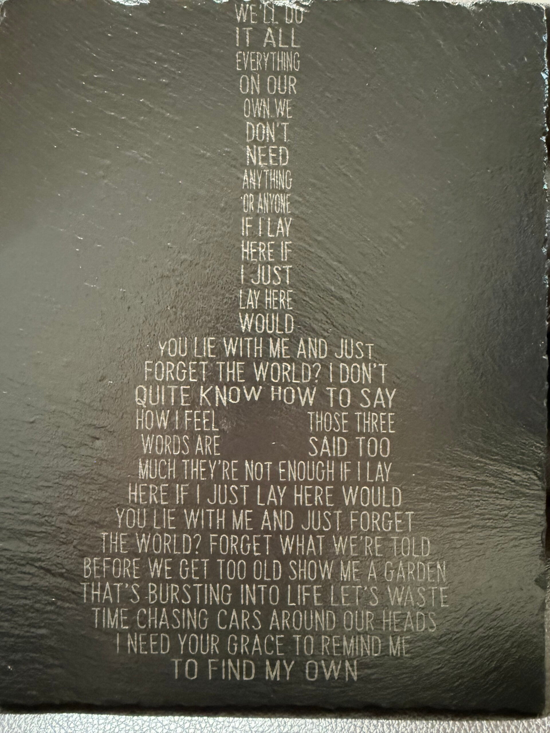 Great gift for the music lover. The lyrics to Snow Patrol Chasing Cars engraved shaped as a guitar.
